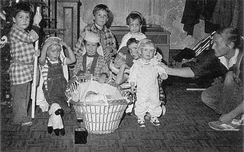 Religious instruction in the LDS family centers around teaching gospel principles to the children. This nativity reenactment was part of a joint family gathering at Christmas in Logan, Utah, 1982. Courtesy Craig Law.