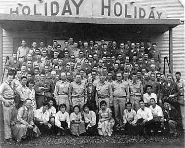 Elder Harold B. Lee (front row, standing) and President Hilton A. Robertson of the Japanese Mission, with LDS servicement at the Chapel in the 8069th AU Compound, Korea, 1954. On this trip, Elder Lee investigated the possibility of opening Korea as a separate mission. Photographer: Jerry Maxwell.