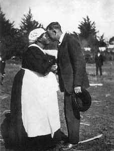 A New Zealand Church member is greeted with the traditional "hongi" by John Shaw Welch, president of the LDS Maori Agricultural College (1917). Friendship, understanding, kindness, love, and service are fostered in the Latter-day Saint communities through personal fellowshipping and social activities. Courtesy Edith W. Morgan.
