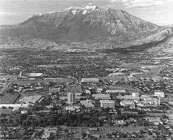 This arial view of Brigham Young University from the south shows the Provo, Utah, campus with Mt. Timpanogos to the north (c. 1985). Courtesy Brigham Young University.