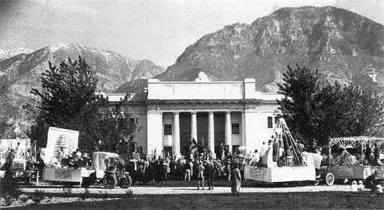 As part of the semicentennial anniversary of Brigham Young University, October 15-17, 1925, a parade passes before the Karl G. Maeser Memorial Building (built 1911). Bibliography Bergera, Gary James, and Ronald Priddis. Brigham Young University: A House of Faith. Salt Lake City, 1985. Brigham Young University Bulletin (annual catalog). Provo, Utah, 1990. Butterworth, Edwin. Brigham Young University: 1,000 Views of 100 Years. Provo, Utah, 1975. Clark, Marden J. "On the Mormon Commitment to Education." Dialogue 7 (Winter 1972):11-19. Holland, Jeffery R. A School in Zion. Provo, Utah, 1988. Kimball, Spencer W. "Second Century Address." BYU Studies 16 (Summer 1976):445-57. King, Arthur H. "The Idea of a Mormon University." BYU Studies 13 (Winter 1973):115-25. Pardoe, T. Earl. The Sons of Brigham. Provo, Utah, 1969. Poll, Richard Douglas. The Honors Program at Brigham Young University, 1960-1985. Provo, Utah, 1985. Waterstradt, Jean Anne, ed. They Gladly Taught: Ten BYU Professors. Provo, Utah, 1986. Wilkinson, Ernest L., et al. Brigham Young University: The First One Hundred Years, 4 vols. Provo, Utah, 1975-1976. Wilkinson, Ernest L., and W. Cleon Skousen. Brigham Young University: A School of Destiny. Provo, Utah, 1976.