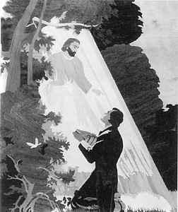 Joseph Receives the Plates, by Max Rezler (1973, Brazil, inlaid wood, 24" x 21"). This work by LDS Brazilian artist Max Rezlerl portrays the occasion when the Angel Moroni, on September 22, 1827, delivered to Joseph Smith the plates containing the Book of Mormon record. Church Museum of History and Art.