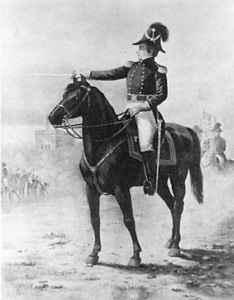 Joseph Smith Directing the Nauvoo Legion, by John Hafen (1887, oil on canvas, 19"x 25"). Joseph Smith in Nauvoo, with the Nauvoo Temple in the background (completed after his death). Joseph Smith was the central religious and political leader of the LDS community in Nauvoo, Illinois, and commander of the Nauvoo Legion. Courtesy Utah State Historical Society.
