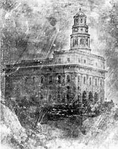 A daguerreotype of the Nauvoo Temple (c. 1846). The Latter-day Saints worked to complete this building and receive the ordinances of the temple before they left Nauvoo for the West. The temple was completed in 1846, burned by an arsonist in 1848, largely demolished by a tornado in 1850, and completely leveled in 1856 for safety reasons.