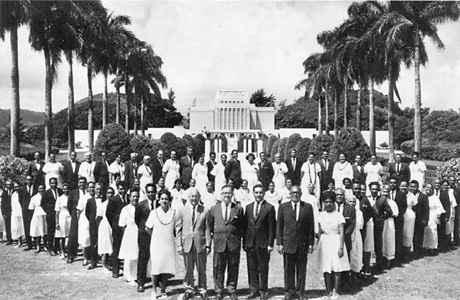 Following the pattern established elsewhere, an attempt was made to gather the Hawaiian Saints to a local Zion. A village, called the City of Joseph, was established on the island of Lanai in 1854. However, the project failed, at least partly because of environmental conditions. In addition, with the most devoted Hawaiian members having moved to Lanai, the branches on other islands were weakened, and the Church fell into decline. This trend became severe when the Mainland missionary leaders were called back to Utah in 1858 because of the Utah expedition. This leadership vacuum opened the way for the adventurer Walter Murray Gibson to run the Church on Lanai and elsewhere as his personal political kingdom from September 1861 until 1864. He was excommunicated from the Church in April 1864 for introducing many false doctrines, including selling offices in the priesthood. Shortly thereafter, President Brigham Young sent Francis Asbury Hammond and George Nebeker to Hawaii to buy property for a new gathering place. On January 26, 1865, the Church purchased for $14,000, a 6,000-acre plantation at Laie on Oahu island for the spiritual and temporal welfare of the members. Laie remains the focal point of LDS activities in Hawaii though strong stakes have also developed in Honolulu and in other areas. Since 1865, there have been five major developments in the History of the Church in Hawaii: First, on June 1, 1915, President Joseph F. Smith dedicated a site at Laie for the Hawaii Temple. Four and a half years later, on November 27, 1919, his successor, President Heber J. Grant, dedicated the completed structure, the first LDS temple outside the North American continent. Second, President Grant organized the Oahu Stake on June 30, 1935, with Ralph E. Woolley as president. Third, for the benefit of the Japanese people in Hawaii, President Grant formed the Japanese Mission in Hawaii in 1937, with Hilton A. Robertson as president. Its name was changed to the Central Pacific Mission in 1942. By 1949 missionaries of the Japanese/Central Pacific Mission had baptized 671 Americans of Japanese ancestry into the Church, and thousands of others have joined the Church since then. Many of these converts and their children have held important positions in the Church. Adney Yoshio Komatsu was the first of that group to be called as a general authority. Fourth, in September 1955 the Church College of Hawaii was founded under the direction of President David O. McKay. Initially a junior college, it was made a four-year school in 1959 and was renamed Brigham Young UniversityHawaii Campus in 1974. Two thousand students, mostly from the Pacific and the Asian Rim, attend. Finally, the Church founded the polynesian cultural center at Laie in November 1963 to preserve and present the cultures of Polynesia and to provide employment for the college students. The center has grown to become Hawaii's number-one paid attraction, drawing nearly a million visitors a year. (See Basic Beliefs home page; Church Organization and Priesthood Authority home page; The Worldwide Church home page) Illustrations