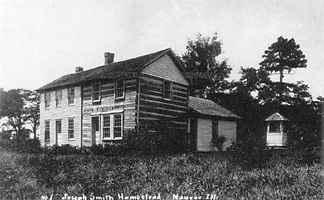 The Joseph Smith homestead in Nauvoo (c. 1930). The prophet and his family lived here from 1839 to 1843. About 1856 the Prophet's son Joseph Smith III added the larger part of the building to the west.