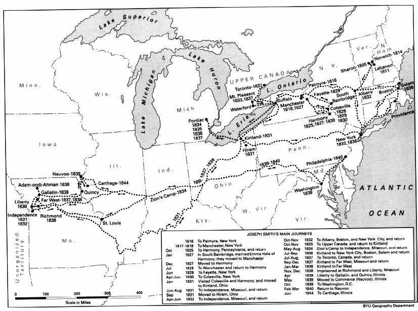 Joseph Smith's main journeys, 1805-1844. Bibliography Anderson, Richard L. Joseph Smith's New England Heritage. Salt Lake City, 1971. Brodie, Fawn M. No Man Knows My History. New York, 1946. Bushman, Richard L. Joseph Smith and the Beginnings of Mormonism. Urbana, Ill., 1984. Ehat, Andrew F., and Lyndon W. Cook. The Words of Joseph Smith: The Contemporary Accounts of the Nauvoo Discourses of the Prophet Joseph. Provo, Utah, 1980. Gibbons, Francis M. Joseph Smith: Martyr, Prophet of God. Salt Lake City, 1982. Hill, Donna. Joseph Smith, The First Mormon. Garden City, New York, 1977. Jessee, Dean C., ed. The Personal Writings of Joseph Smith. Salt Lake City, 1984. . The Papers of Joseph Smith. Salt Lake City, 1989- . Millet, Robert L., ed., Joseph Smith: Selected Sermons and Writings. New York, 1989. Porter, Larry C., and Susan Easton Black, eds. The Prophet Joseph: Essays on the Life and Mission of Joseph Smith. Salt Lake City, 1988. Smith, Lucy. Biographical Sketches of Joseph Smith the Prophet. Liverpool, 1853.
