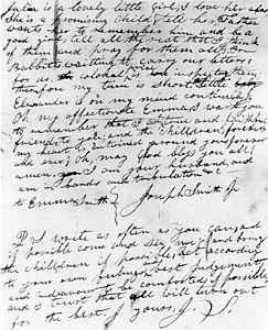 Several factors influenced and initially limited the extent of Joseph Smith's writings and the literary style of his prose. Because of the indigent circumstances of his family, his formal schooling was very little, the basics of reading, writing, and arithmetic constituting, so he said, his entire scholastic preparation. Some who heard him noted that he seemed to have little native talent or training as a speaker. He felt inadequate as a writer, referring on one occasion to "the little narrow prison almost as it were total darkness of paper, pen, and ink." But whatever the Prophet lacked in formal rhetorical training was compensated for by his message. Beginning in his early life, religious experiences inspired him with a strong sense of mission that propelled him onto the stage of public controversy. He saw his mission as laying a foundation that would revolutionize the whole world, not by sword or gun but by "the power of truth." The articulation of that truth was the impetus of his writings. Many who heard him were awed by his ability to make plain the way of life and salvation. Many outsiders found his views striking and magnetic. His writings carry the same sense of purpose and conviction. A study of early Mormon sources indicates that only a fraction of Joseph Smith's writings and teachings were preserved. This was the result of haphazard record-keeping procedures during his early lifetime; the incompetence or untimely death of some of his clerks; long imprisonments; vexatious and repeated lawsuits; poverty; and disruptive conditions that forced the migration of the Latter-day Saints across two-thirds of the American continent. Joseph Smith's dependence upon others to write for him also complicates the record. His philosophy was that "a prophet cannot be his own scribe." Hence, most of his writings were dictated, and some ghostwritten, but approved and accepted by him. While the presence of clerical handwriting in his papers helps date the source material, it does obscure his own image and necessitates a careful look at the sources for those who would distinguish the Prophet's mind and personality from those who assisted him. Joseph's writings are characterized by long, unbroken sentences connected by conjunctions, descriptive images, and an astute narrative sense. As a keen student of the scriptures, his prose is interspersed with biblical word forms and examples, and breathes a positive tone, reflecting a sense of vitality and love. His writing style and personality show up most clearly in his holograph writings. These show a conversational style, in contrast to the more formal manner of associates like Sidney Rigdon. Typical of his handwritten prose is this extract from an 1838 letter to his wife Emma written while in jail at Richmond, Missouri: Brother Robison is chained next to me he he has a true heart and a firm mind, Brother Whight, is next, Br. Rigdon, next, Hyram, next, Parely, next Amasa, next, and thus we are bound together in chains as well as the cords of everlasting love, we are in good spirits and rejoice that we are counted worthy to be persecuted for Christ sake, tell little Joseph, he must be a good boy, Father loves him With a perfect llove, he is the Eldest must not hurt those that Are smaller then him, but cumfort them tell little Frederick, Father, loves him, with all his heart, he is a lovely boy. Julia is a lovely little girl, I love hir also She is a promising child, tell her Father wants her to remember him and be a good girl, tell all the rest that I think of them and pray for them all, little baby Elexander is on my mind continuly Oh my affectionate Emma, I want you to remember that I am a true and faithful friend, to you and the children, forever, my heart is intwined around you[r]s forever and ever, oh may God bless you all amen you I am your husband and am in bands and tribulation &c [Jessee, 1984, p. 368]. Joseph Smith's writings