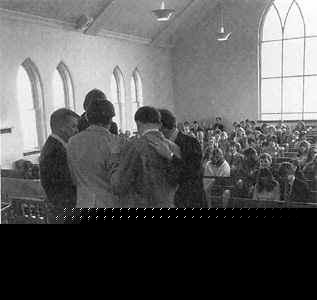 A father, assisted by other men who hold the Melchizedek Priesthood, gives his infant child a name and a father's blessing during a sacrament meeting (c. 1975; see D&C 20:70). Fathers may also bless their children at other times of need. Courtesy Doug Martin.