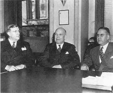 The Presiding Bishopric in 1947 (from left): first counselor Joseph L. Wirthlin, presiding bishop LeGrand Richards, and second counselor Thorpe B. Isaacson. Under the energetic leadership of Richards, the Presiding Bishopric improved record-keeping, youth programs, ward teaching, and management of Church properties and temporal affairs.