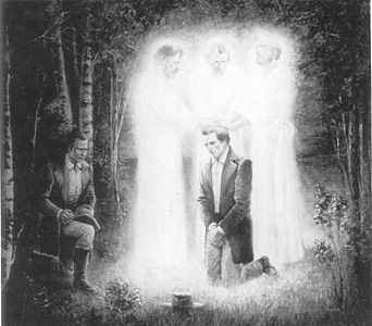 Restoration of the Melchizedek Priesthood, by Gary E. Smith (1980, oil on canvas, 36" x 42"). The apostles Peter, James, and John bestowed the Melchizedek Priesthood upon Joseph Smith and Oliver Cowdery. Courtesy Blaine T. Hudson.