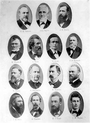 First Presidency and Quorum of the Twelve Apostles (in 1884). Top Row: George Q. Cannon, President John Taylor, Joseph F. Smith. Apostles (second row) Wilford Woodruff, Lorenzo Snow, Erastus Snow, Franklin D. Richards, (third row) Brigham Young, Jr., Albert Carrington, Moses Thatcher, Francis Marion Lyman, (fourth row) John Henry Smith, George Teasdale, Heber J. Grant, John W. Taylor.