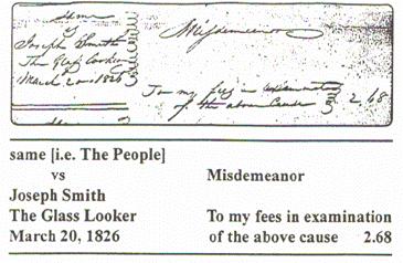 Walters's discovery consisted mainly of two documents. The first was a bill of costs presented to local authorities by Justice Albert Neely in 1826 which identified Joseph Smith as "The Glass Looker" and indicated that he was charged at the trial with a "misdemeanor." Neely's bill reported that his total charges for the case were $2.68, the precise amount shown in Fraser' s Magazine.