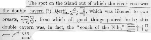 17. Budge, Ibid., p. 53. Cf. Budge, An Egyptian Hieroglyphic Dictionary, Dover, 1978, 2 vols, see vol. 2, p. 774 under "Qer-t" 2nd column, last word, "hollow, cavern, cave, source of Nile..." See p. 775 1st column, 5th word down, "Qer-ti, Qerr-ti" which has many variations, including the half sky sign said to represent "the two caverns in the First Cataract out of which the Nile was believed to rise." Cf. A. M. Blackman, "Some Notes on the Ancient Egyptian Practice of Washing the Dead," in Journal of Egyptian Archaeology, 1918, p. 118 where the Nile as originating in the first cataract was also considered to be the sacred fluid of Osiris' body.